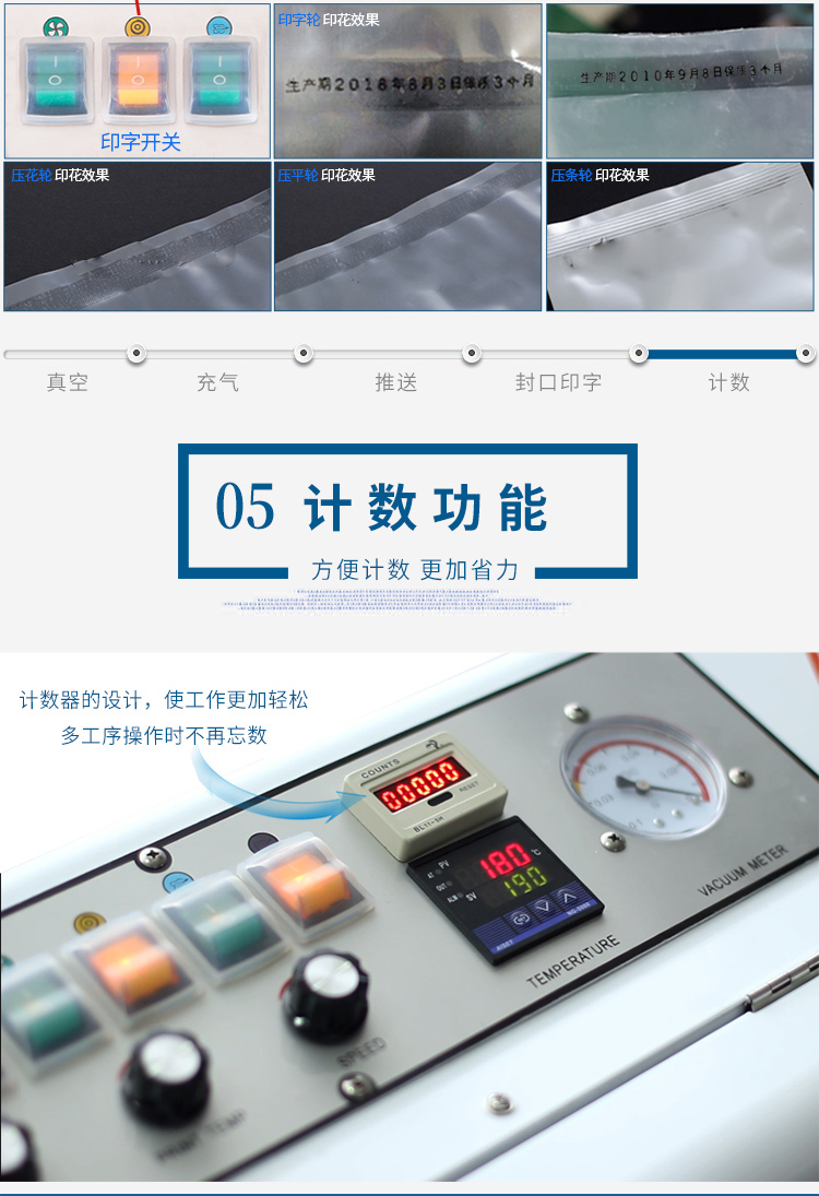 LF1080系列連續(xù)式真空抽氣/充氣封口機(jī)。是本公司在廣泛吸取國外同類產(chǎn)品和真空機(jī)之精華的基礎(chǔ)上研制的專利產(chǎn)品,該產(chǎn)品是根據(jù)市場需求而設(shè)計(jì)的新一代真空、推送、封口、印字集一體的連續(xù)式包裝機(jī),該機(jī)結(jié)構(gòu)簡單新穎,外觀美麗時(shí)尚、功能齊全,自動(dòng)化程度高,能大幅度減輕操作人員的勞動(dòng)強(qiáng)度。具有安全可靠,操作簡便,真空度高,熱合快捷封口美觀、牢固等優(yōu)點(diǎn)