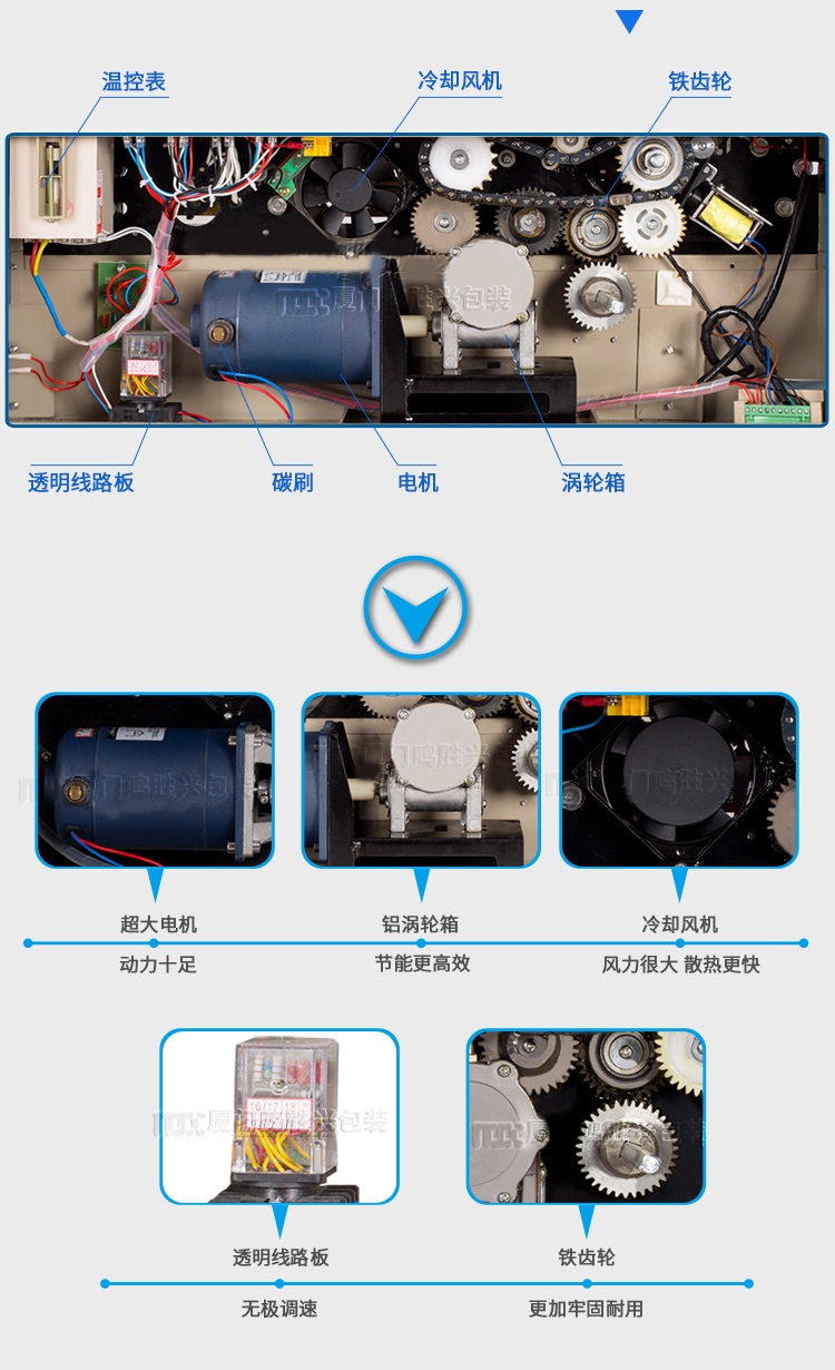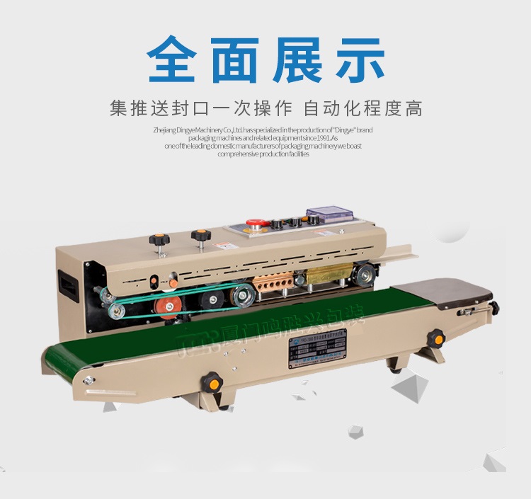 該機(jī)具有連續(xù)輸送、封口、油墨印制標(biāo)簽(出廠日期、生產(chǎn)批號等)一次完成之功效,可封合印制任何一種可熱性的薄膜。