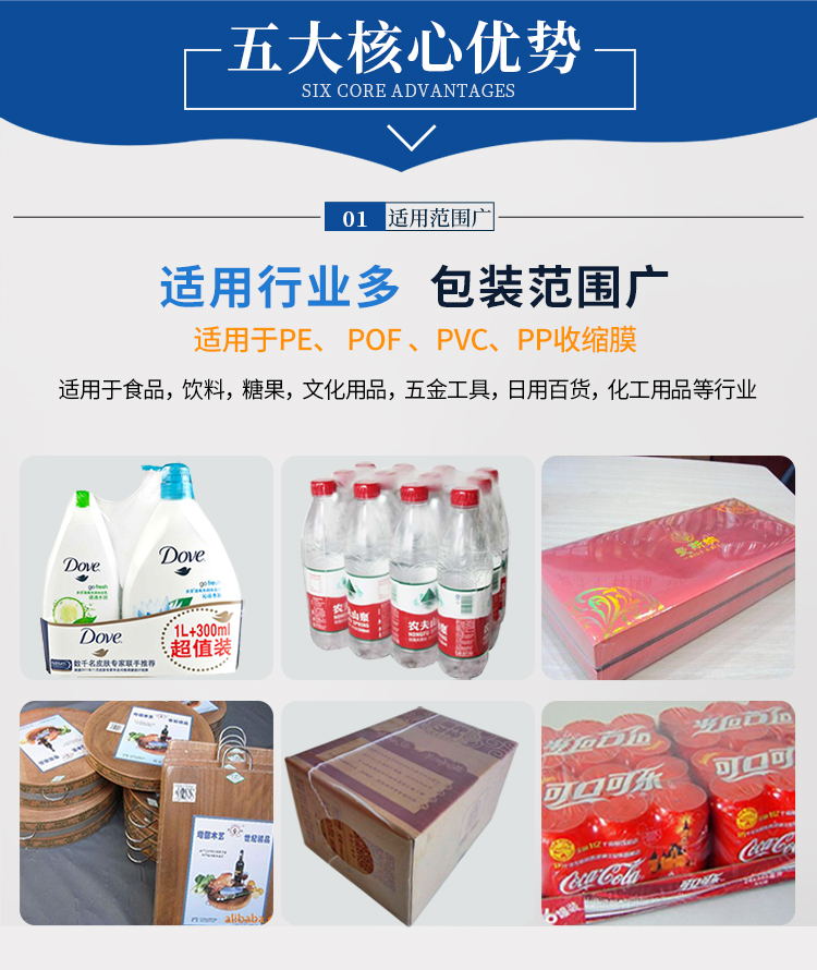熱收縮包裝是目前市場(chǎng)上較為先進(jìn)的包裝方法之一,它是采用收縮薄膜包裹在產(chǎn)品或包裝件外面,經(jīng)過(guò)加熱,使收縮薄膜收縮裹緊產(chǎn)品或包裝件,充分顯示才、物品的外觀,提高產(chǎn)品的展銷性,增加美觀及價(jià)值感。同時(shí),包裝后的物品能密封、防潮、防污染,并保護(hù)商品免受來(lái)自外部的沖擊,具有一定的緩沖性,尤其是當(dāng)包裝易碎品時(shí),能防止器械破碎時(shí)飛散。此外,可降低產(chǎn)品被拆、被竊的可能性。適用于食品、飲料、糖果、文華用品、五金工具、日用百貨、化工用品等行業(yè)。