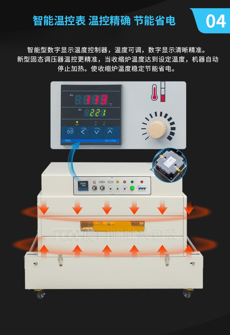 高配低臺熱收縮包裝機采用收縮薄膜包裹在產品外面,經過加熱,使收縮薄膜收縮裹緊產品,充分顯示物品的外觀,包裝后的物品能密封防潮防污染。